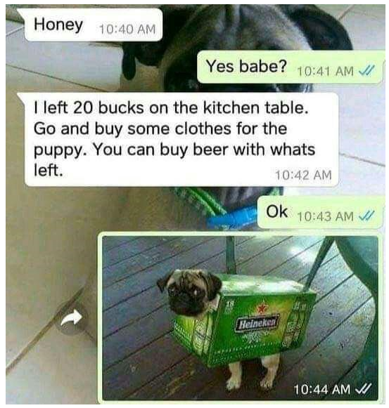 해석: 여보 탁자에 20달러 올려놨으니 강아지 옷 좀 사고 남은돈으로 맥주사먹어~~